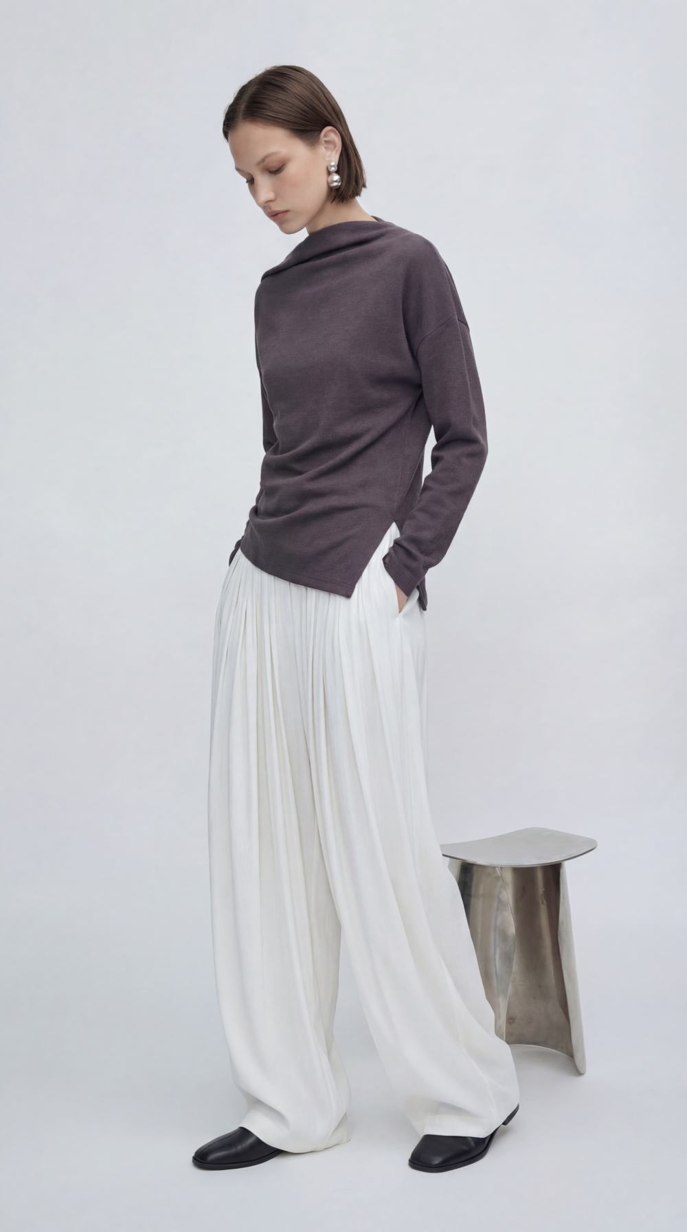비대칭 보트넥으로 하프 오프 숄더 연출 가능
