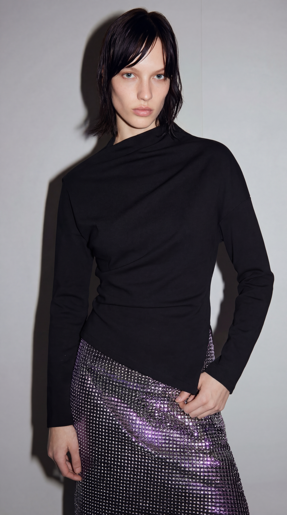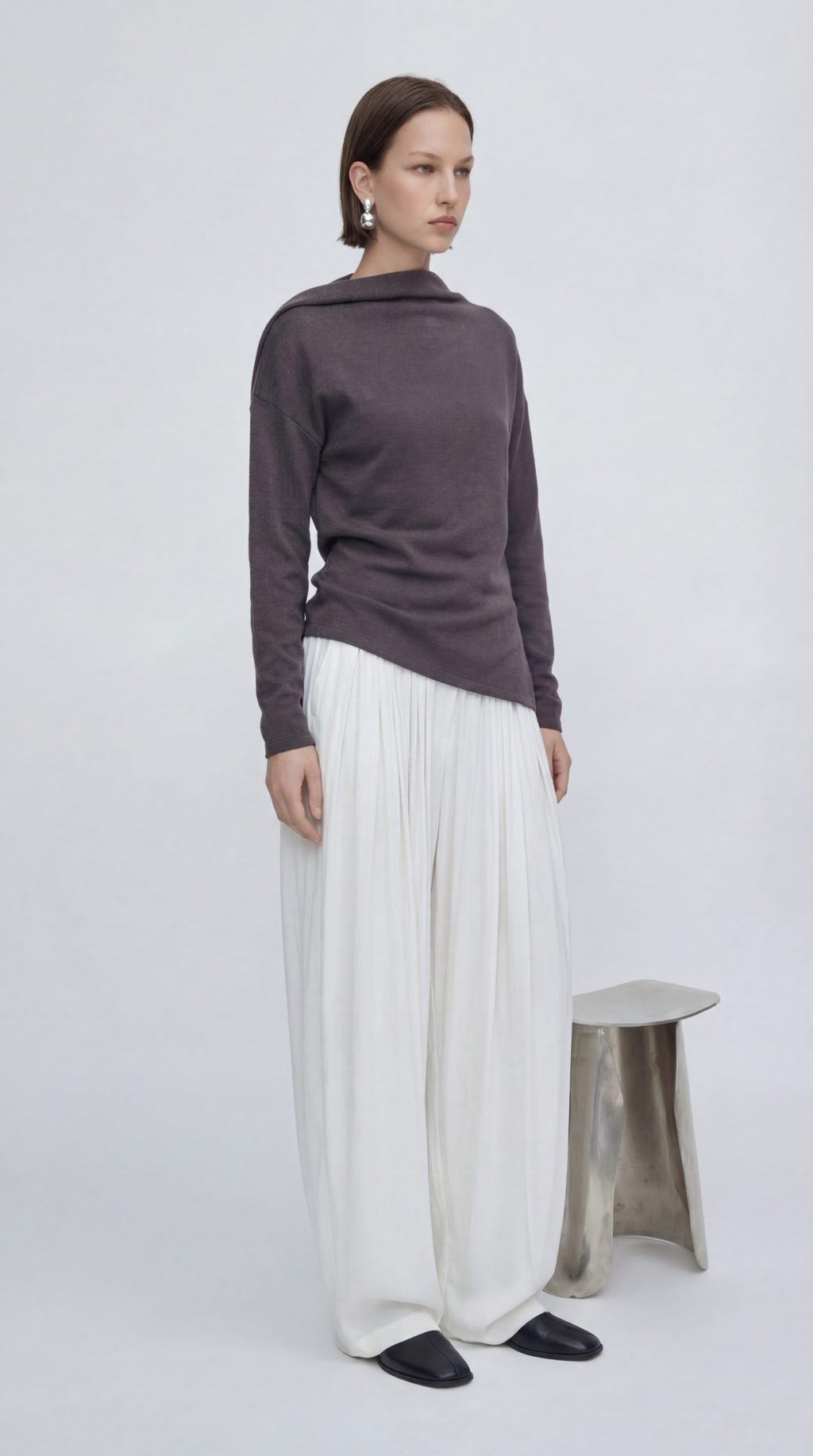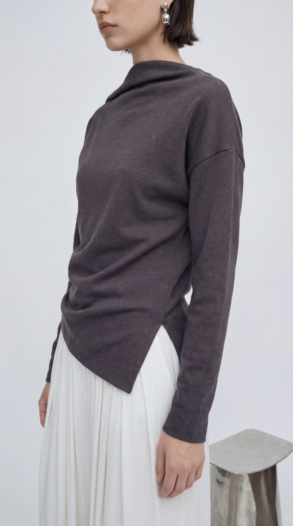 비대칭 입체 드레이핑의 세련된 네크라인
