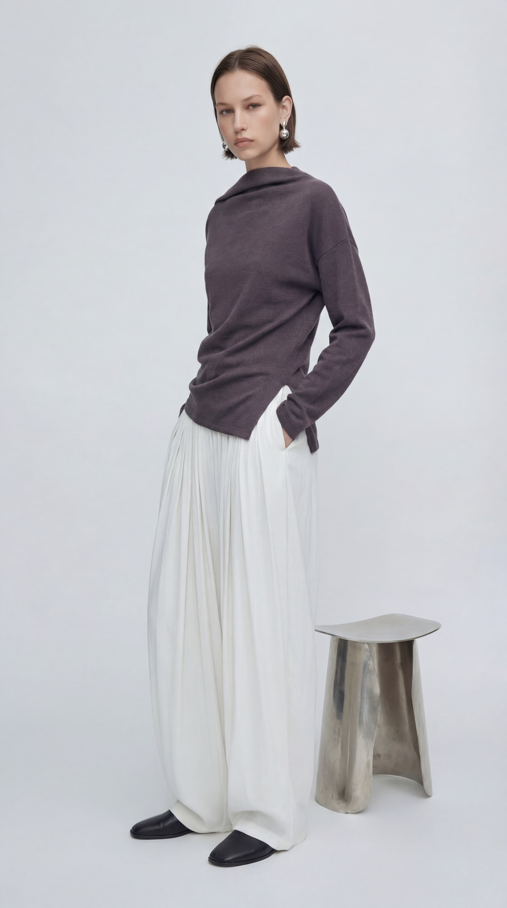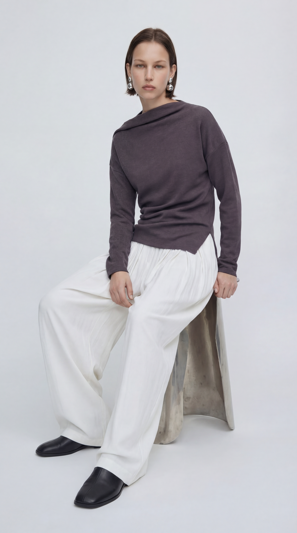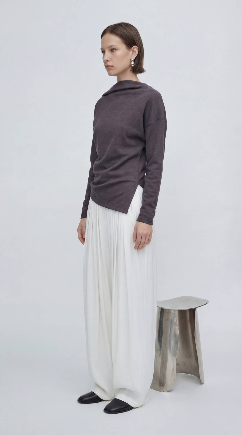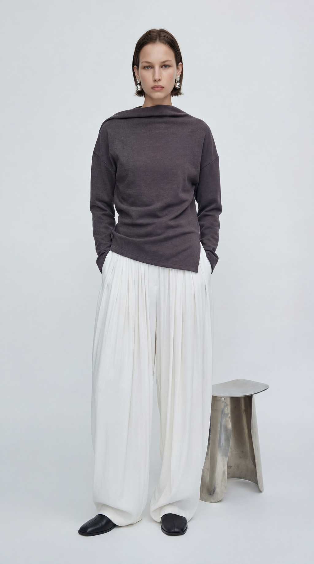 비대칭 입체 드레이핑의 세련된 네크라인