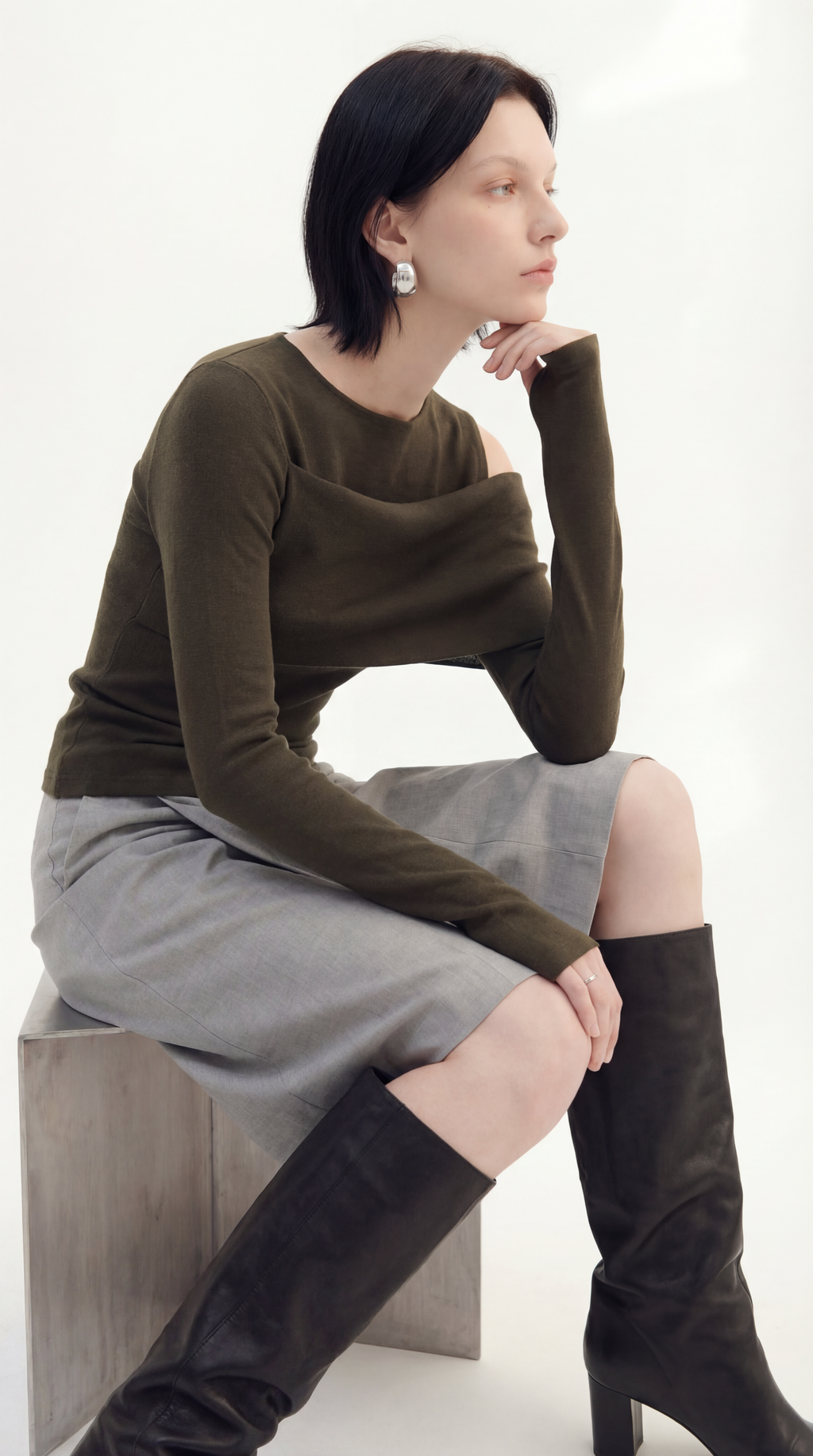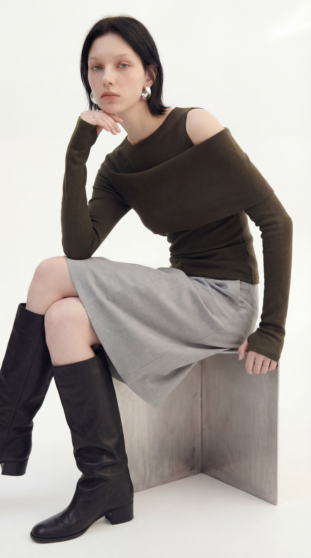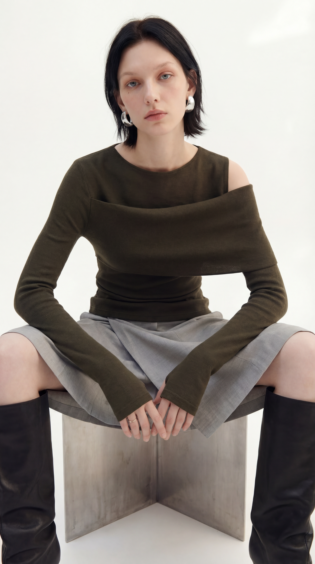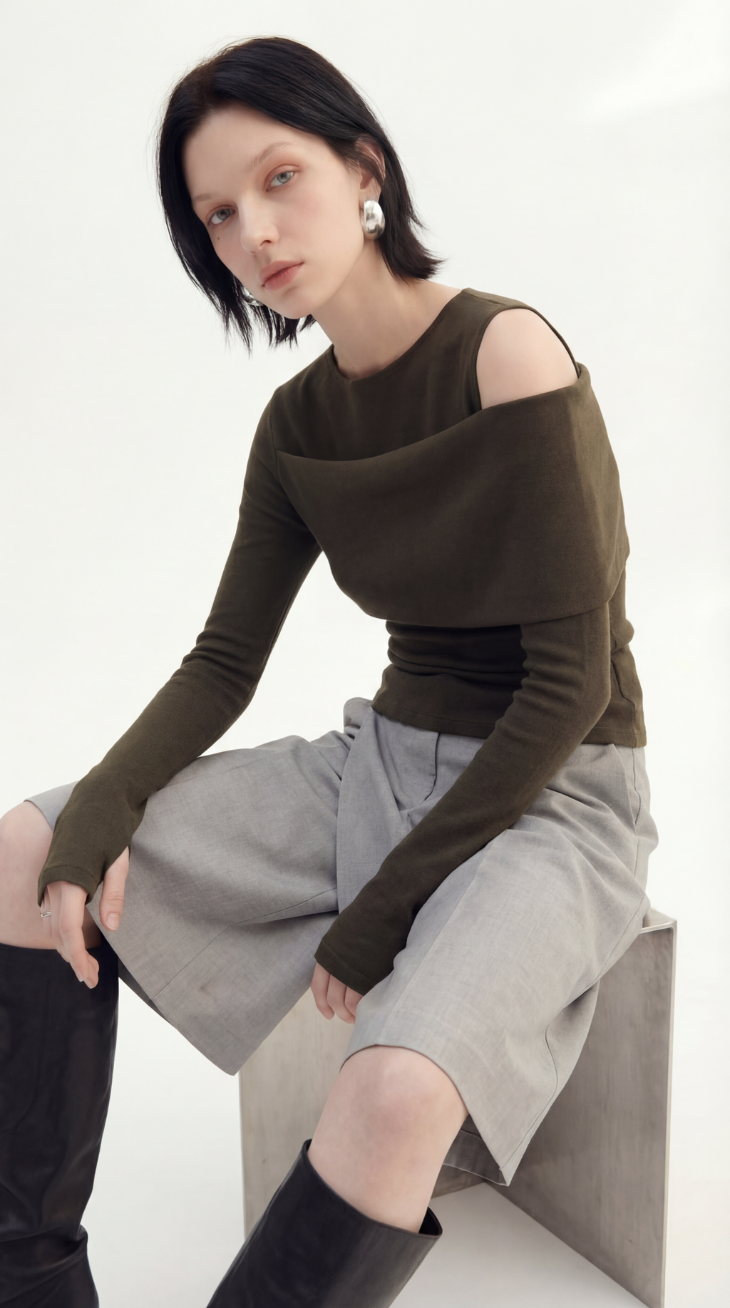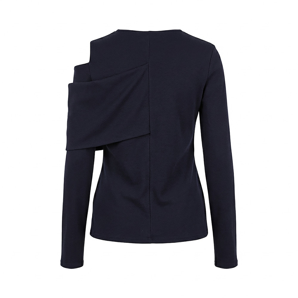 구조적이면서 멋스러운 느낌을 연출하는 비대칭 오프숄더 디자인