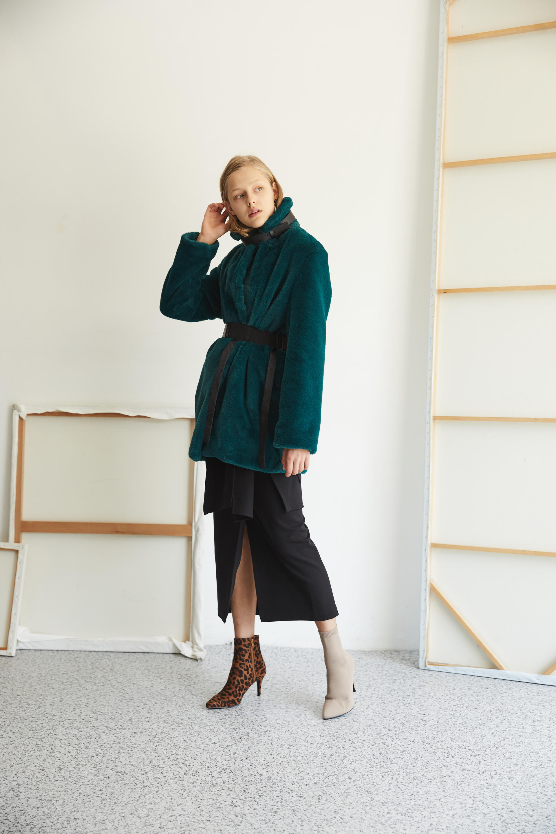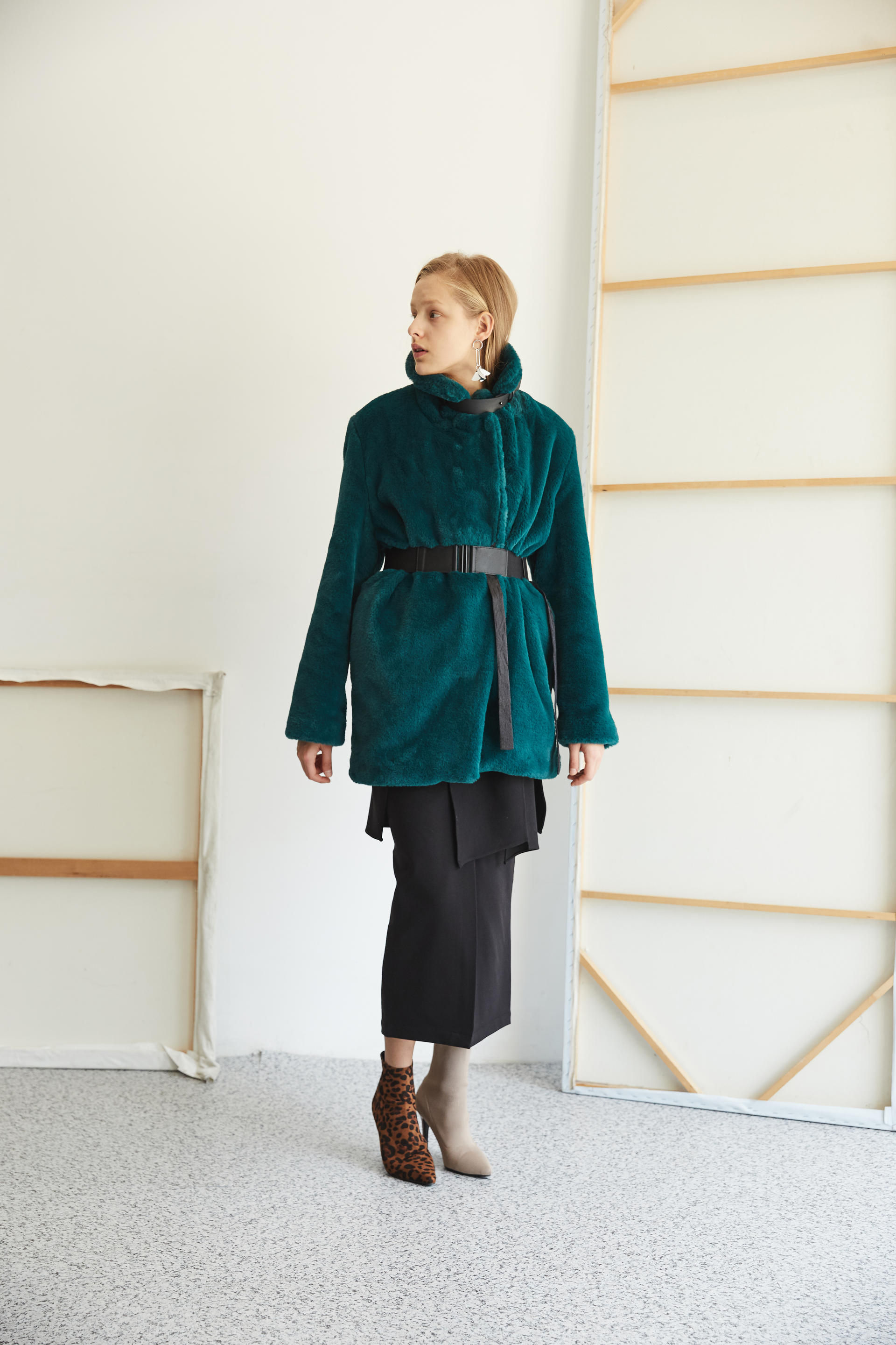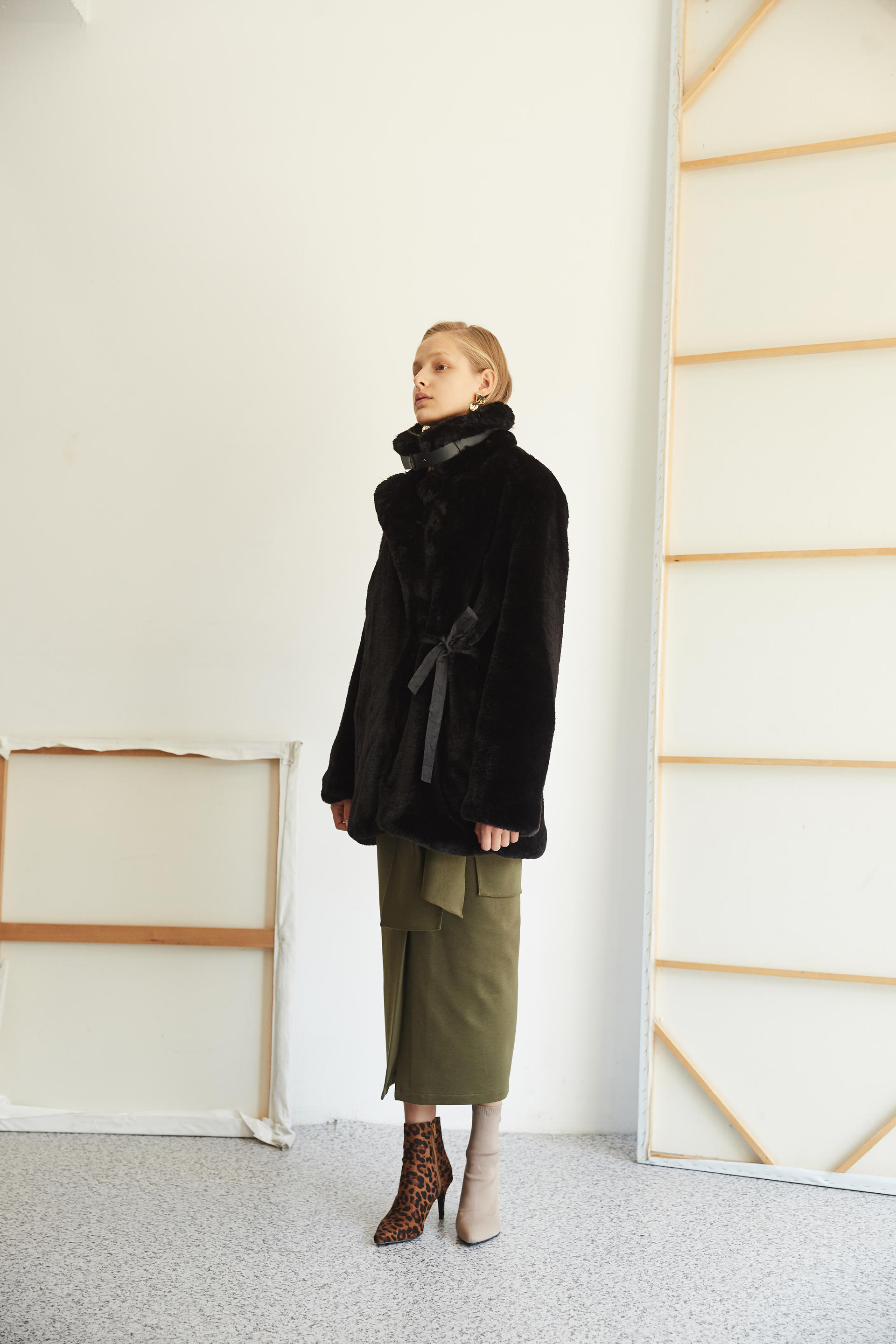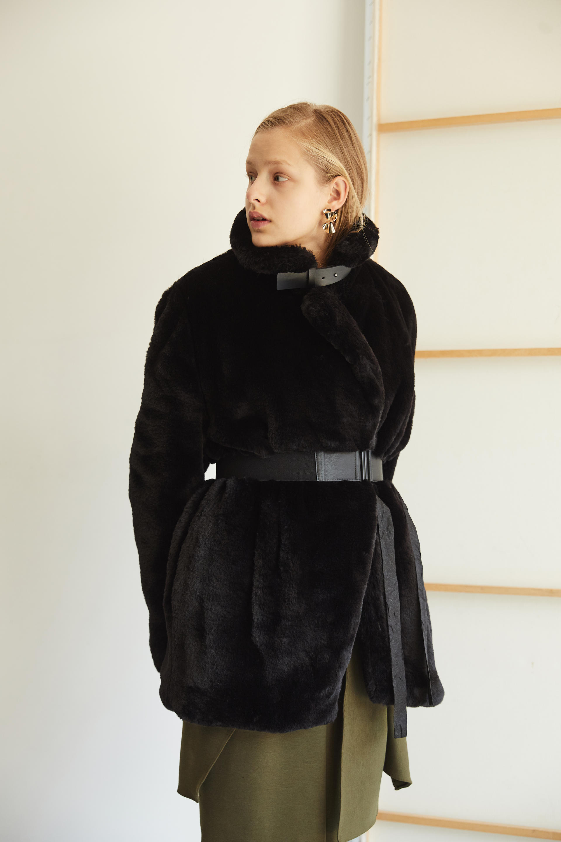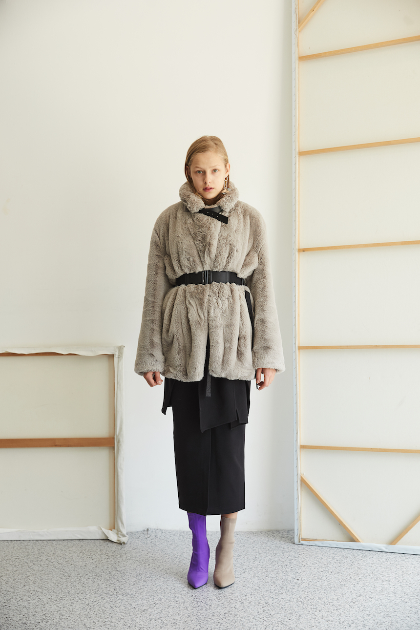 가죽 넥 벨트 디테일로 하이넥 스타일 연출