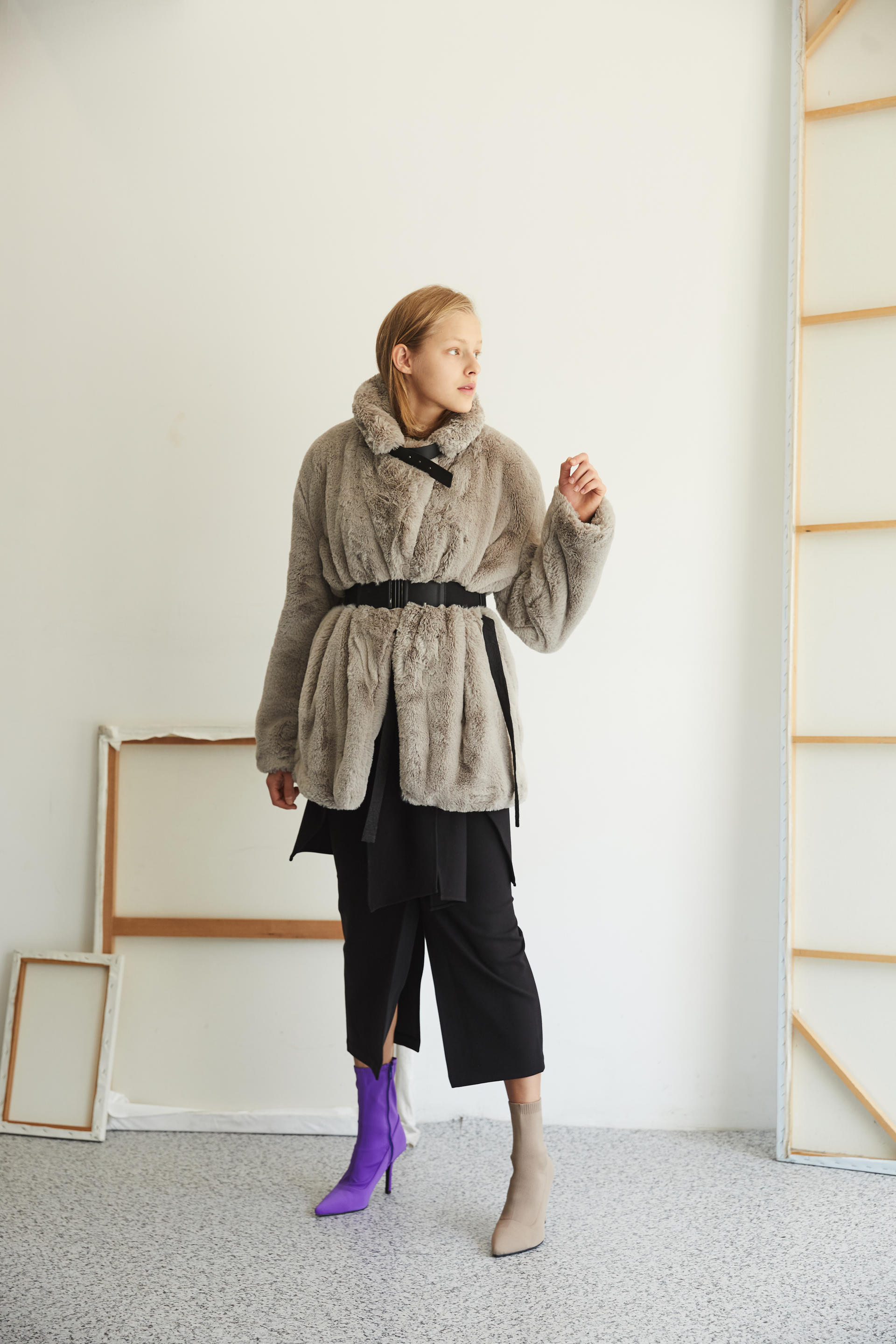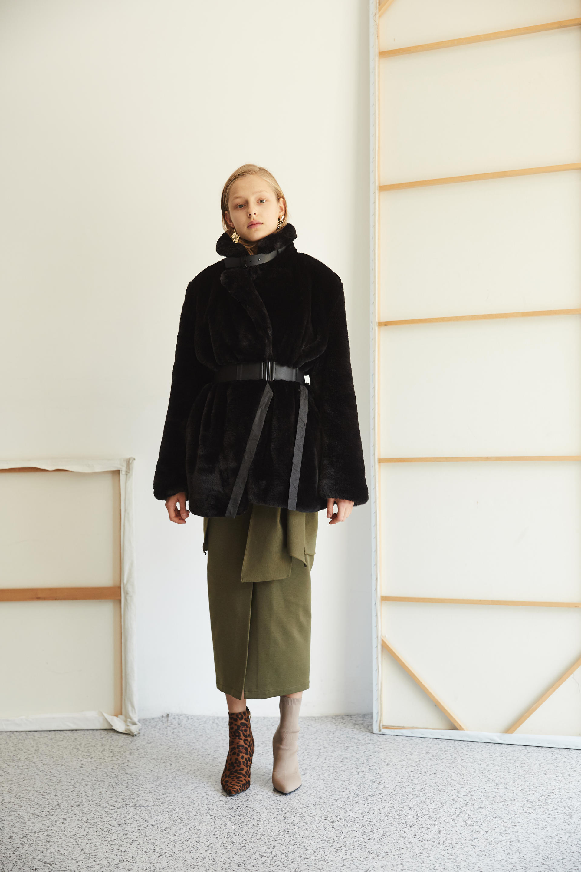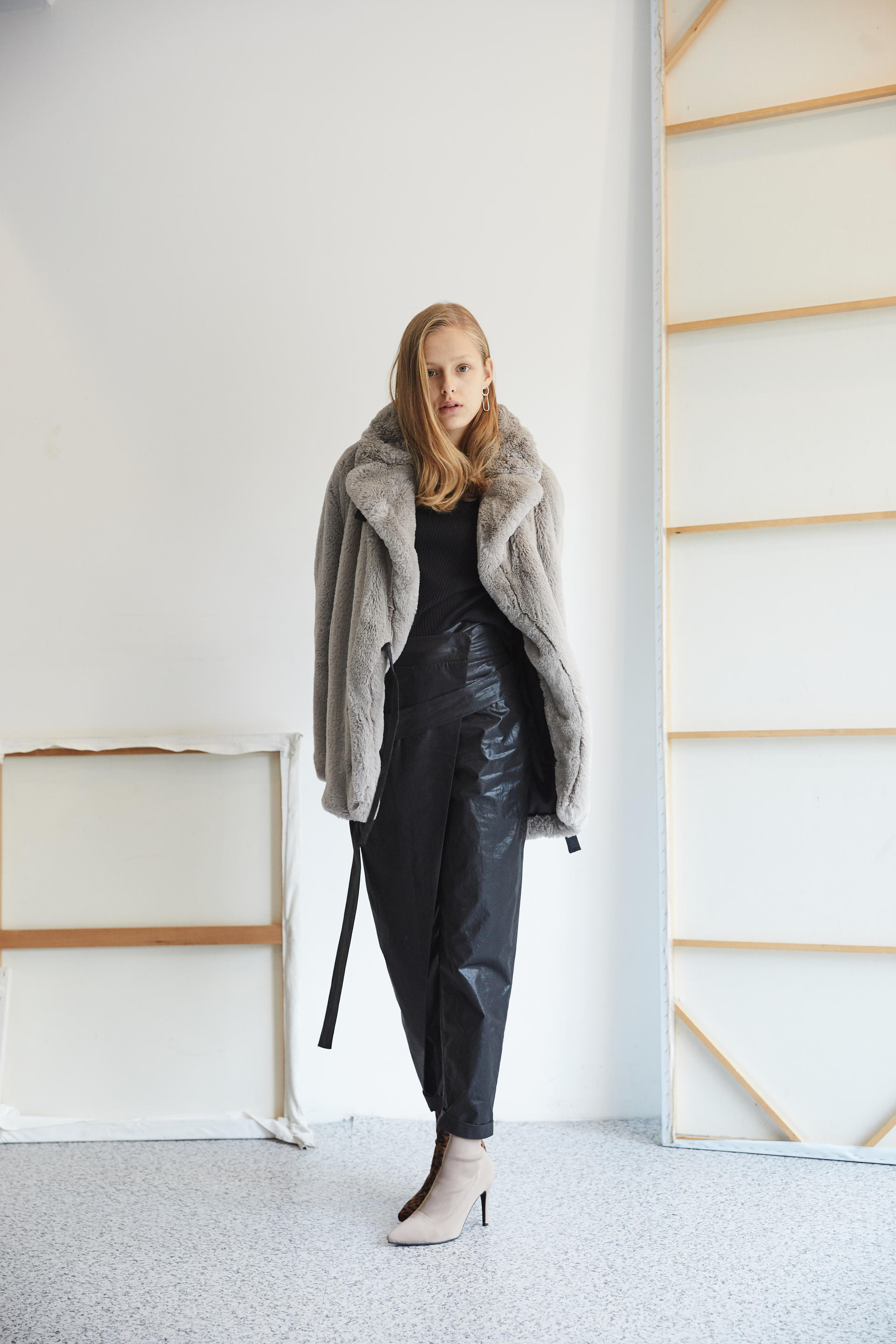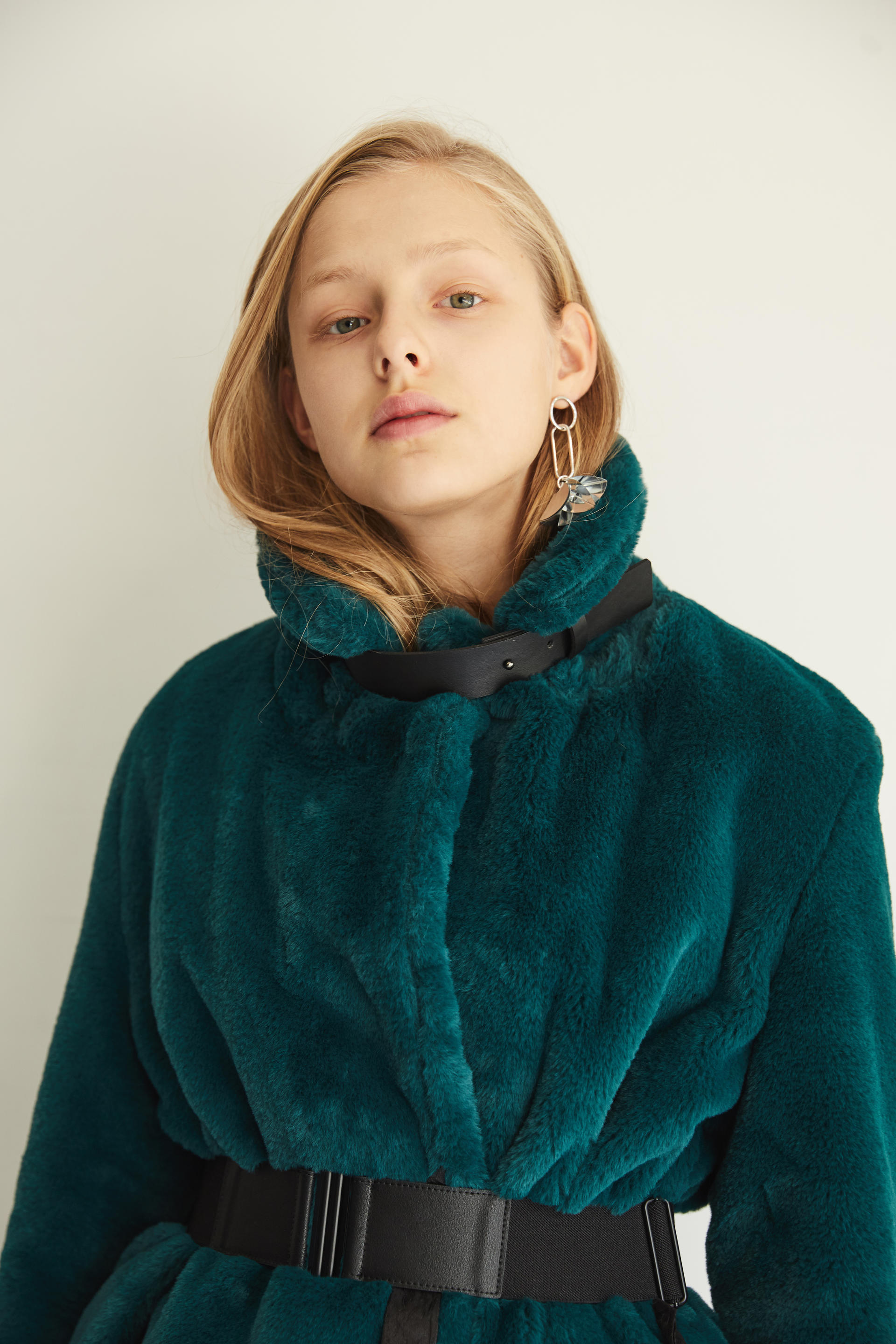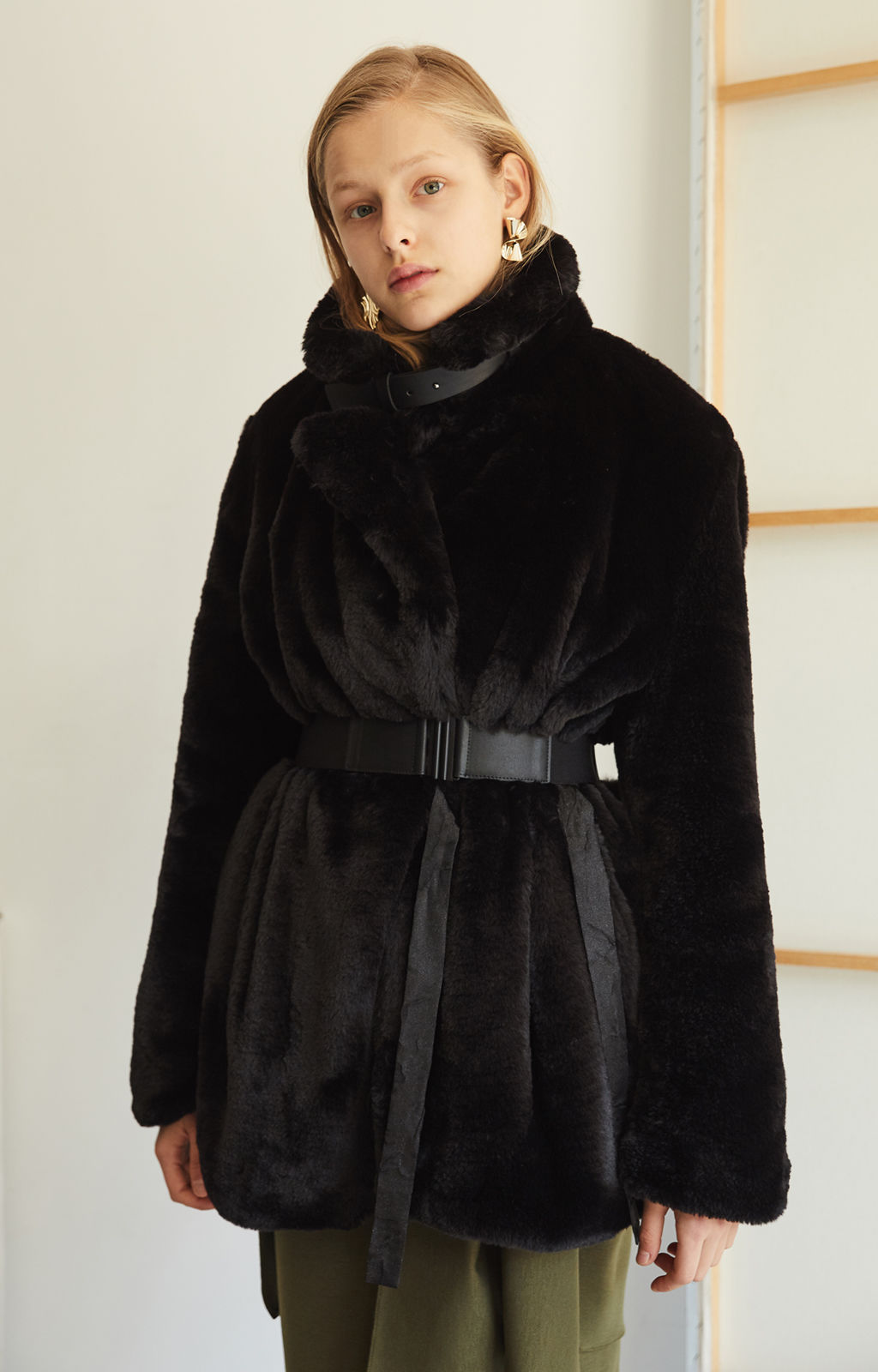 가죽 넥 벨트 디테일로 하이넥 스타일 연출