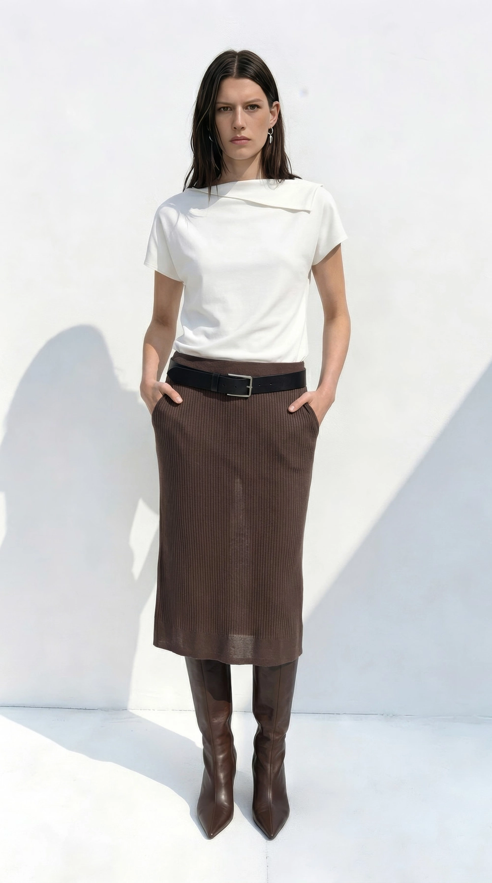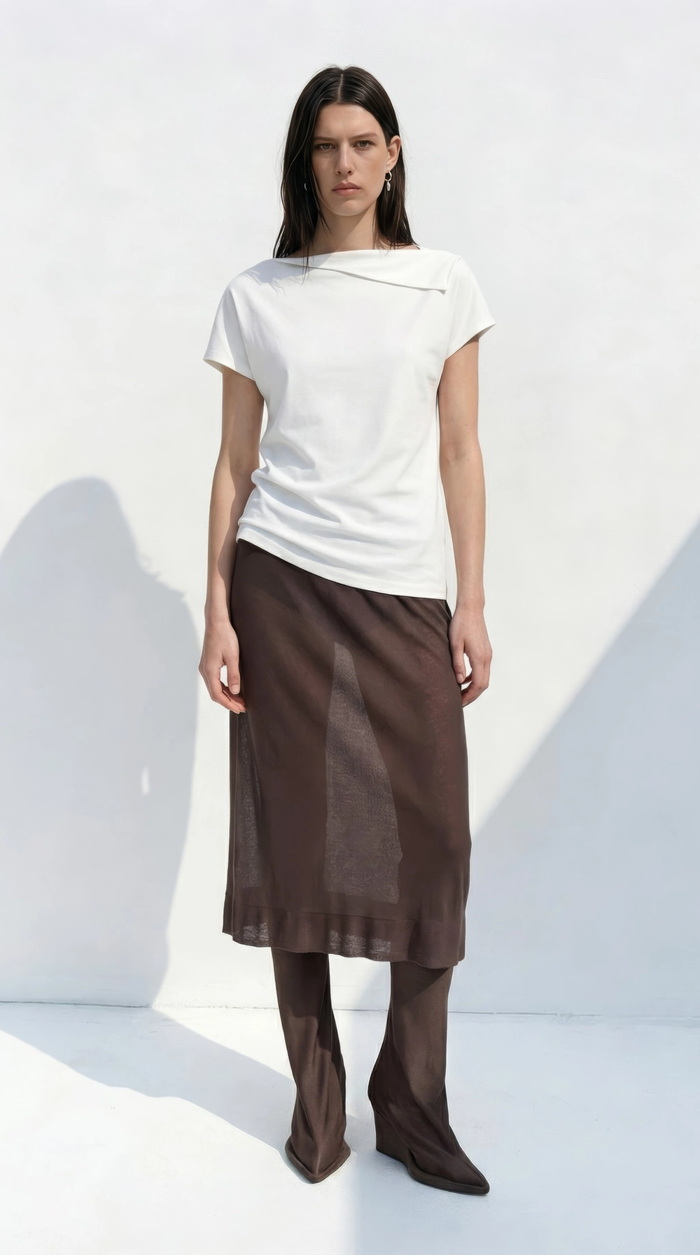 사선 커팅 넥으로 슬림한 네크라인 연출